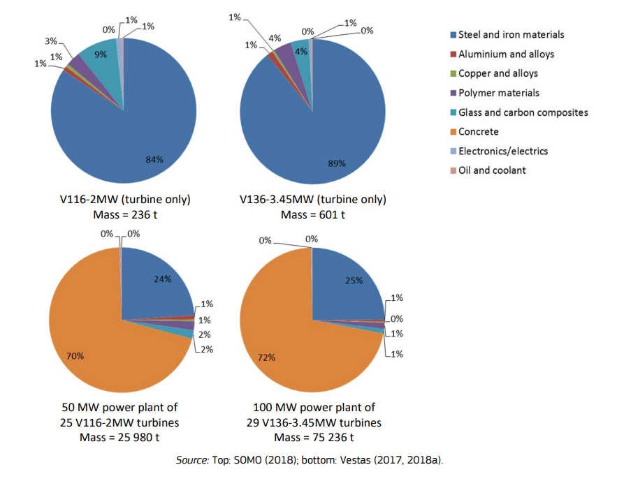 A megújuló technológiák szentháromságának (nappanel, szélkerék, villanykocsi) érdekes közös jellemvonása, hogy szerkezeteik meglepően sok anyagot tartalmaznak. A szélturbinák (csak a turbinák) tömege 236 és 600 tonna között lavíroz, a teljes tornyok súlya szálanként 25 000 és 75 000 (!) tonna között ingázik (összehasonlításul: egy IFA max 6 tonnát bír). Ennek ugyan a 75%-a beton, és “csak” 200-500 tonna vasat-acélt használnak egyenként, de emellett is fejenként 20-60 tonna alumíniumot és 20-60 tonna rezet emésztenek fel. Ezeknek pedig ugye nem csak a kitermelése felfoghatatlanul energiaigényes, de a mozgatásuk az országokon keresztül sem kifejezetten környezetsemleges telekinézissel történik.